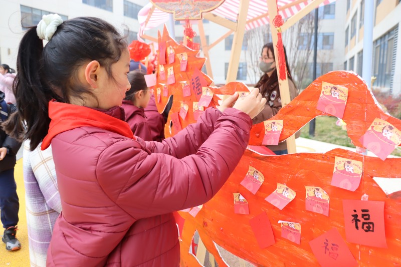 西咸新区沣东第七学校将传统民俗与开学迎新深度融合,精心开展挂灯笼、猜灯谜、投壶、纳福拓福、书写心愿五大主题活动。同学们亲手点亮灯笼,寄托新学期美好希望;在趣味灯谜中感受中华优秀传统文化的智慧;于投壶游戏中体验古人之雅趣;拓印福字,将福气与美好收入囊中;写下心愿卡片,郑重立下成长目标。欢声笑语间,中华优秀传统文化浸润心田,仪式感点亮新学期。