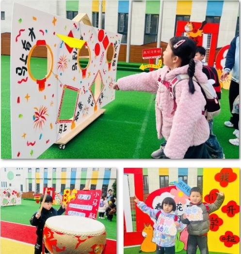 空港新城花园幼儿园打造马年特色开学场景,园内五道彩色“五福门”跨栏贴满新春祝福,萌娃们在大班“小马引导员”陪伴下依次跨栏、齐喊童趣口号;“小马照相馆”前,孩子们自选马年手举牌打卡,定格开学美好;操场“小马摸高墙”趣味互动中,孩子们跳跃拍响新年铃铛,立下成长小目标;“小马敲鼓启新站”里,萌娃敲响铜锣,齐诵新学期心愿。老师们也送上暖心寄语:“愿宝贝们如春日小马,快乐成长,勇敢探索!”
