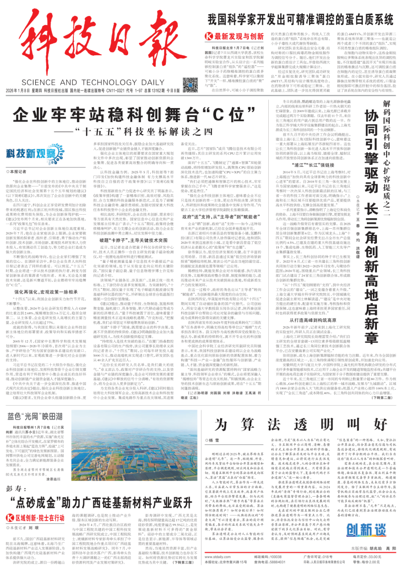 科技日报头版刊发《企业牢牢站稳科创舞台“C位”》