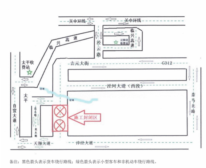 沿G211由泾阳县前往秦汉(空港)新城方向车辆,请绕行高太路、北太路、天翔大道;沿G211由秦汉(空港)新城前往泾阳县方向车辆,请绕行天翔大道、北太路、高太路行驶。