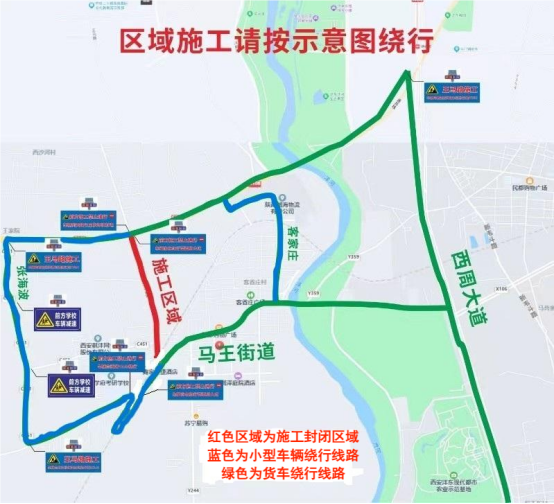由G310前往西宝老线方向车辆,请绕行G310、西周大道、鱼斗路、西宝老线行驶;由西宝老线前往G310方向车辆,请绕行西宝老线、鱼斗路、西周大道、G310行驶。