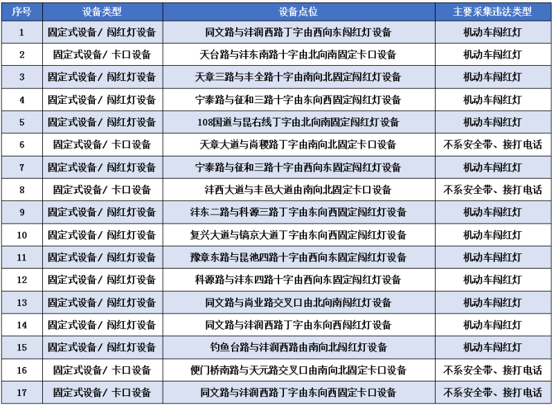 凡在上述点位,有驾驶机动车违反道路交通信号通行、违反禁令标志及禁止标线指示、逆向行驶、不礼让行人、压线、不按规定车道行驶、不系安全带、接打电话、违法停车等交通违法行为的,将按照《中华人民共和国道路交通安全法》等相关规定予以处罚。