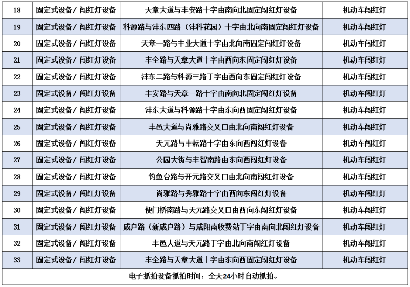 为进一步加强西咸新区重点道路交通管理,优化道路通行环境,预防和减少道路交通事故发生,保障广大人民群众的生命财产安全,根据《中华人民共和国道路交通安全法》《中华人民共和国道路交通安全法实施条例》等法律法规的有关规定,结合西咸辖区道路交通实际,现决定自2024年7月4日零时起正式启用以下33处违法抓拍取证设备,现将新增道路交通违法采集点位公示如下: