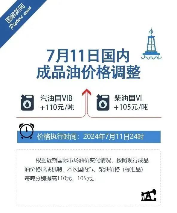 国家发展改革委发布消息,根据近期国际市场油价变化情况,按照现行成品油价格形成机制,自2024年7月11日24时起,国内汽、柴油价格每吨分别提高110元、105元。