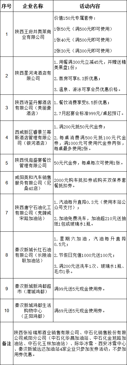 本次活动共有西咸新区秦汉新城辖区14家企业参与,涵盖购物餐饮、酒店住宿、加油洗车服务等消费场景。