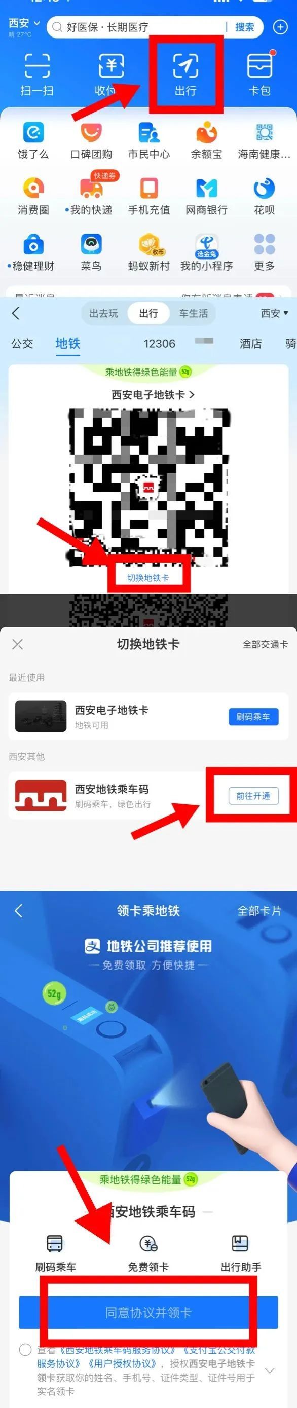 如何申领“西安地铁乘车码”?在支付宝主界面点击“出行”,进入地铁界面后,在二维码下方选择“切换地铁卡”,再点击开通“西安地铁乘车码”按照指引操作即可。