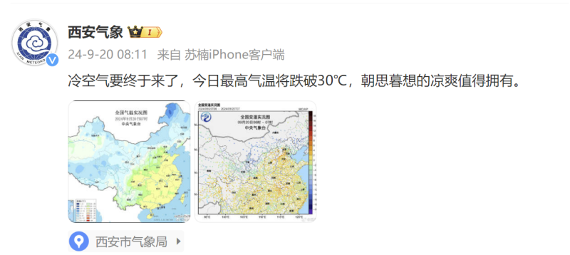 据西安气象发布的最新消息,冷空气马上就到,今日最高气温将跌破30°C。