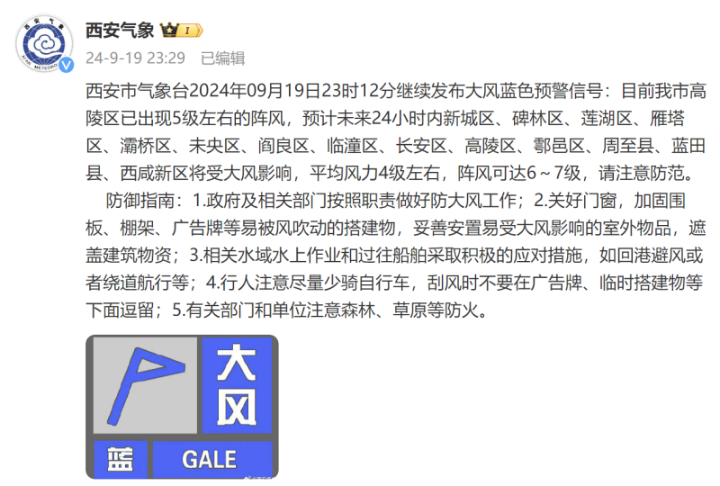 西安市气象台2024年9月19日23时12分继续发布大风蓝色预警信号:目前西安市高陵区已出现5级左右的阵风,预计未来24小时内新城区、碑林区、莲湖区、雁塔区、灞桥区、未央区、阎良区、临潼区、长安区、高陵区、鄠邑区、周至县、蓝田县、西咸新区将受大风影响,平均风力4级左右,阵风可达6~7级,请注意防范。