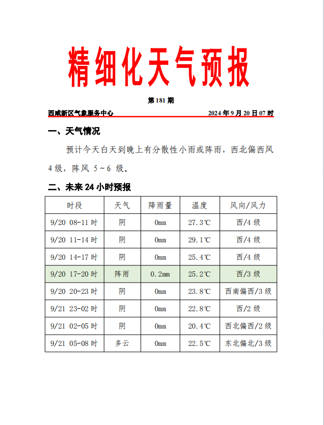 预计今天白天西咸新区有分散性小雨或阵雨,18时左右本轮降水将逐渐结束,今日午后至夜间风力较强,全区有4-5级偏西风,阵风可达6-7级。