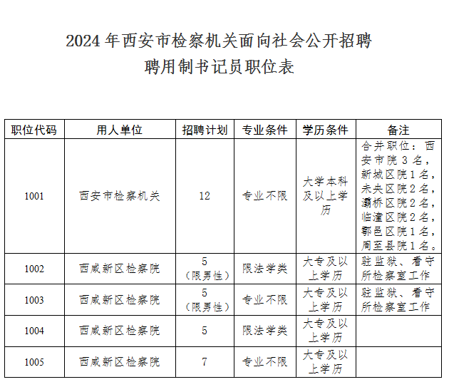 根据工作需要及相关政策规定,结合市县两级院聘用制书记员缺额情况及西咸新区检察院筹建需要,西安市检察机关2024年面向社会公开招聘聘用制书记员34名,现将有关事项公告如下: