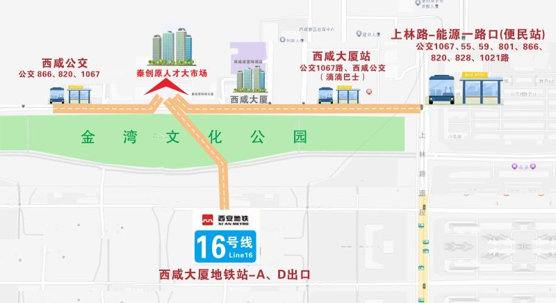 方式一:西安地铁16号线“西咸大厦”站A/D口出,步行至“西咸大厦”楼宇西侧100米即到。