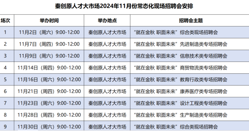 11月份,秦创原人才大市场将举办9场不同主题类型现场招聘会,满足各企事业单位和广大求职者双选需求,具体安排如下。