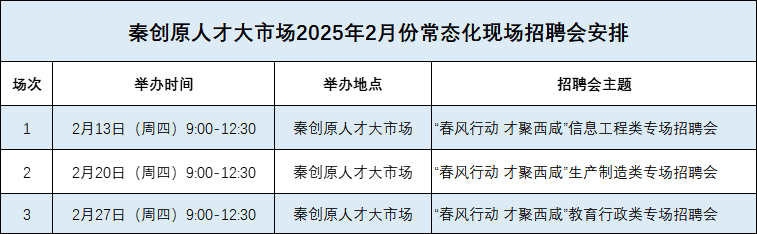 本月,秦创原人才大市场将举办多场不同主题类型现场招聘会并启动2025年“春风行动”系列招聘活动,满足各企事业单位和广大求职者双选需求,具体安排如下。