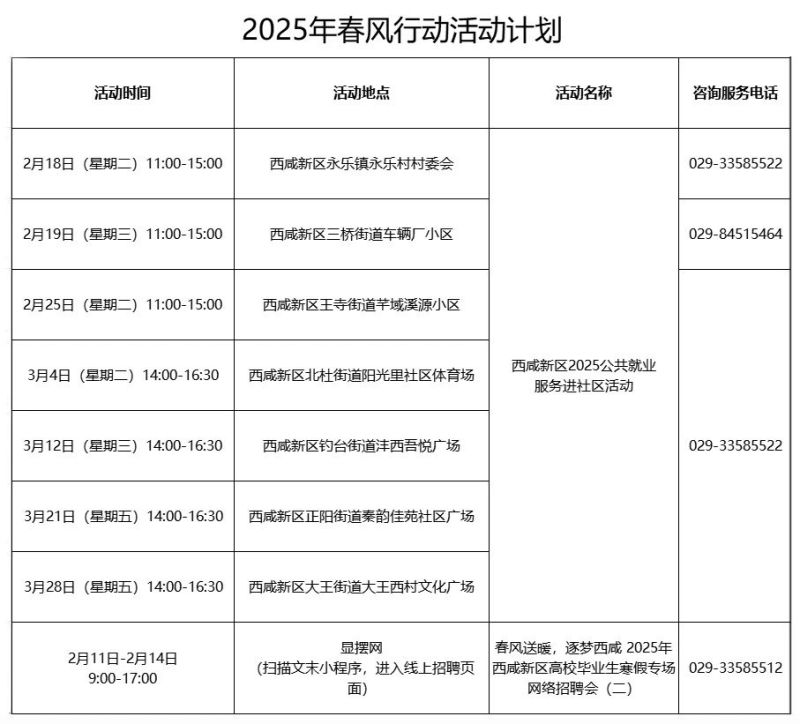 此外,西咸新区举办的2025年“春风行动”系列招聘活动,近期还将启动多场线上线下招聘会,具体安排如下。
