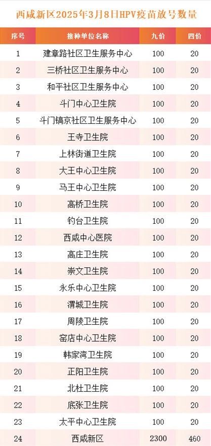 2025年3月8日上午10:00开始。本次西咸新区开放23个接种门诊号源,接种日期从3月9日起至4月7日共30天,23个接种门诊支持四价HPV疫苗预约460人,九价HPV疫苗预约2300人。预约成功,系统提示。