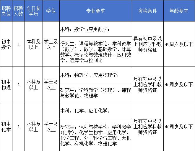 报考教师岗位的,满足以下条件之一者,学历可放宽至大专,专业不限,教师资格证学科不作要求,年龄放宽至45周岁(1979年4月3日以后出生):