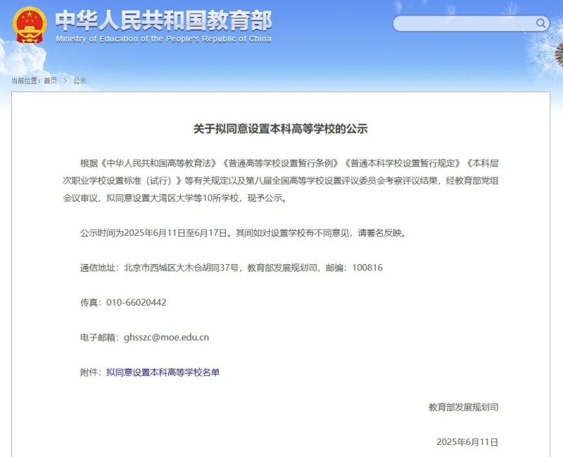 根据《中华人民共和国高等教育法》《普通高等学校设置暂行条例》《普通本科学校设置暂行规定》《本科层次职业学校设置标准(试行)》等有关规定以及第八届全国高等学校设置评议委员会考察评议结果,经教育部党组会议审议,拟同意设置大湾区大学等10所学校,现予公示。
