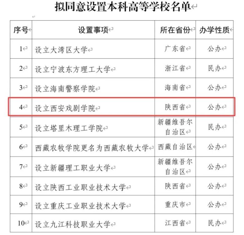 6月11日,教育部官网发布关于拟同意设置本科高等学校的公示,其中,备受社会关注的西安戏剧学院也在公示名单之列。