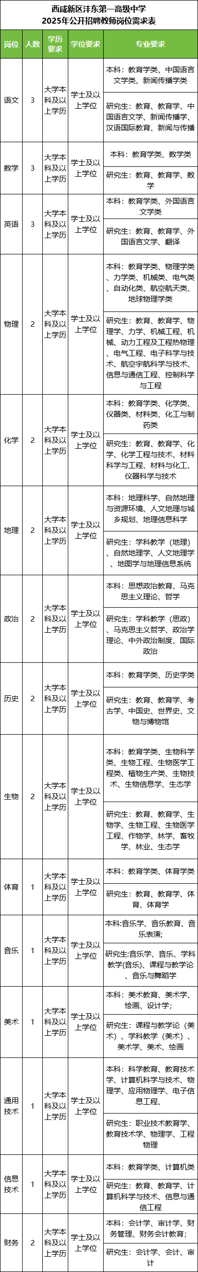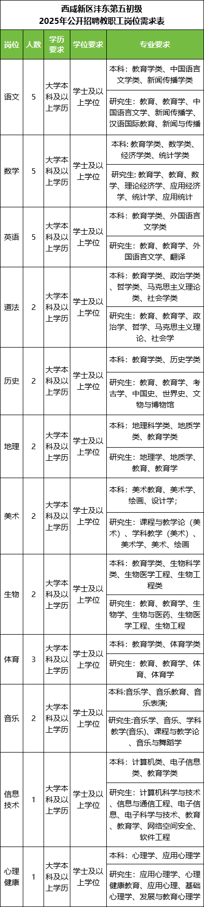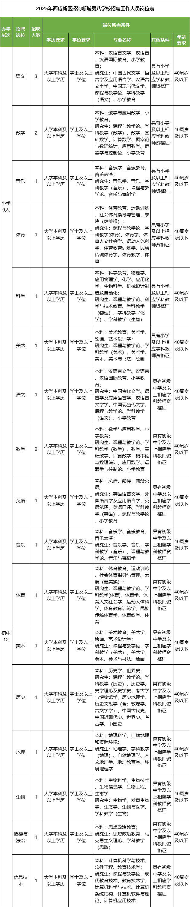 8.具备招聘岗位所需的其他条件。招聘岗位所需的具体条件以《西咸新区沣东第五初级2025年公开招聘教职工岗位需求表》;《西咸新区沣东第一高级中学2025年公开招聘教师岗位需求表》的要求为准。