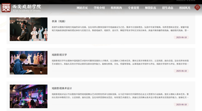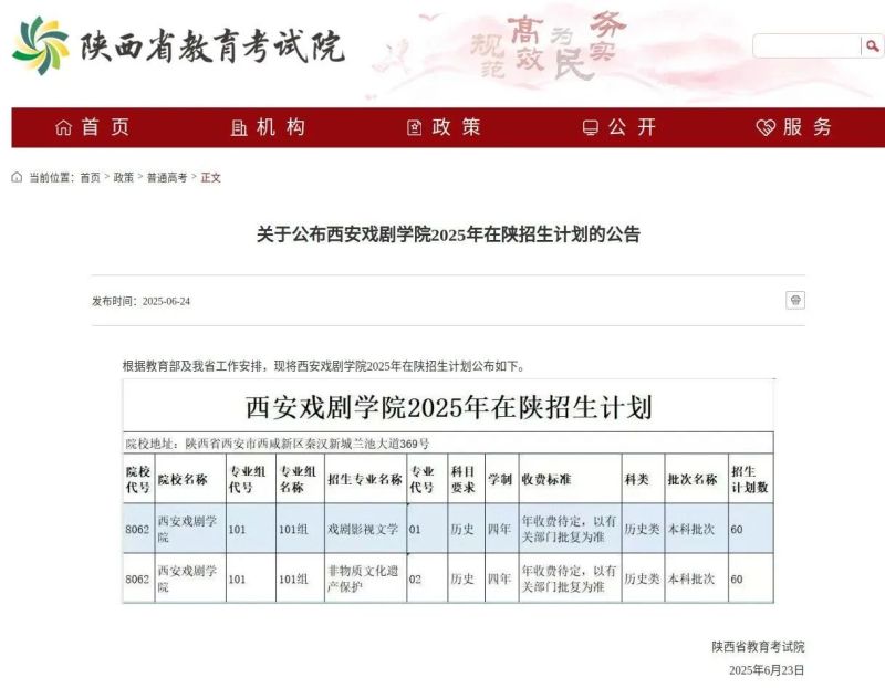6月24日,陕西省教育考试院发布《关于公布西安戏剧学院2025年在陕招生计划的公告》,戏剧影视文学、非物质文化遗产保护两个专业共计划招收120名本科生。