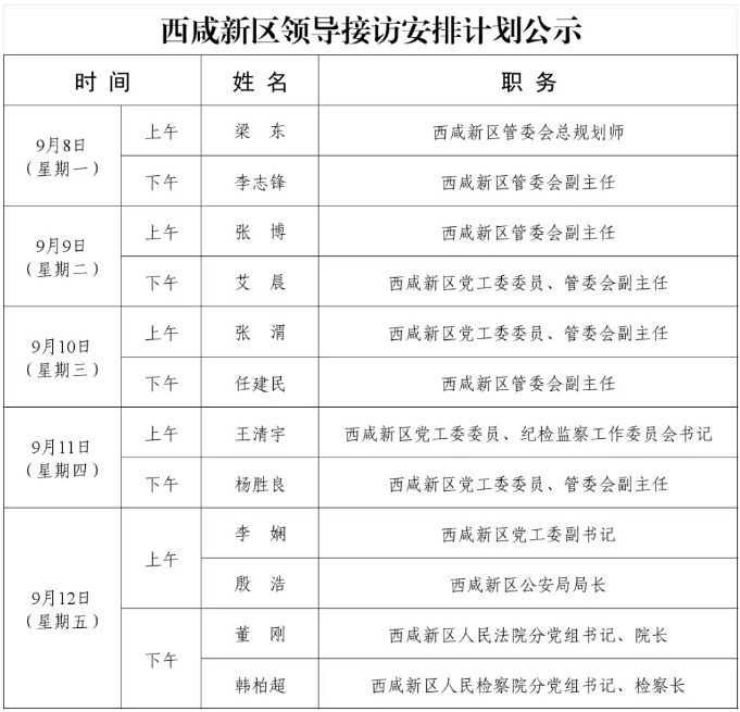 为进一步畅通信访渠道,方便群众及时就地反映诉求、解决问题,现将9月8日-9月12日西咸新区领导接访安排计划公示如下: