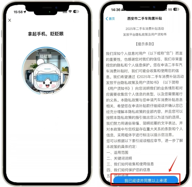 在【首页】点击轮播图【二手车购置补贴】或下方图标,点击【同意并授权】进入活动页面。