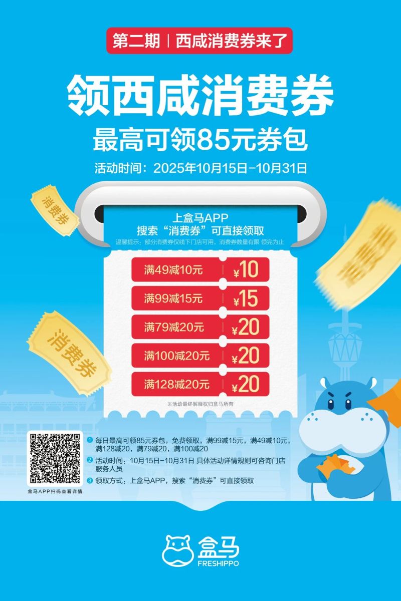 10月15日至10月31日,西咸新区第二批电商平台消费补贴活动即将开启,此次补贴覆盖陕西省内所有盒马门店,消费者可通过盒马APP领取消费券在购物时享受优惠。