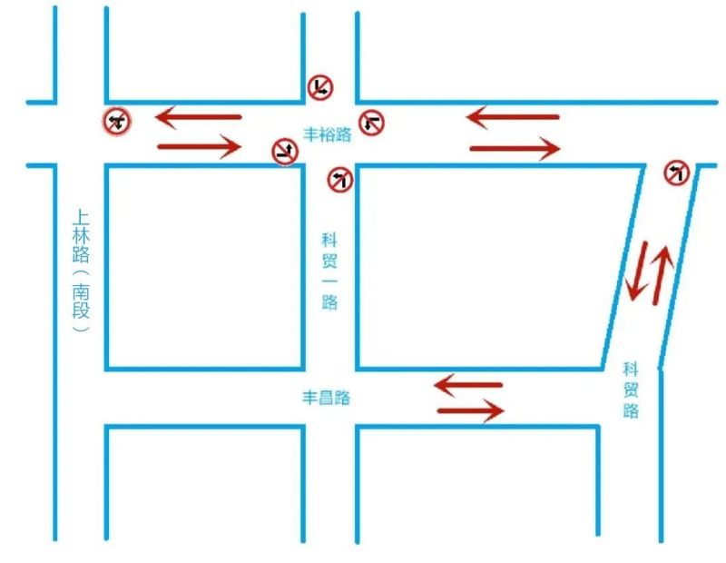 为缓解丰裕路周边交通压力,提高车辆通行效率,经西咸交警大队多次实地调研,决定自2022年11月7日0时起,西咸新区能源金贸区丰裕路(科贸路至上林路南段)、丰昌路(科贸路至科贸一路段)、科贸一路(丰昌路至丰裕路段)由原单向行驶变为双向行驶。同时采取部分路口禁止左转措施,其中:丰裕路与科贸路丁字口,禁止由南向西左转;丰裕路与科贸一路十字,四个方向禁止左转;丰裕路与上林路南段十字,禁止由东向南左转及直行。