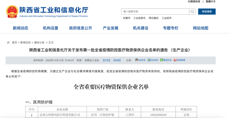 根据全省疫情防控形势需要,为建立生产企业与社会需求精准对接渠道促进全省疫情防控相关医疗物资有效供给,12月14日,陕西省工业和信息化厅发布第一批全省疫情防控医疗物资保供企业(生产企业)名单。