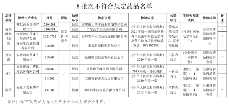 一、经苏州市药品检验检测研究中心检验,标示为辅仁药业集团有限公司、江西钟山药业有限责任公司、好医生药业集团有限公司生产的4批次清热解毒口服液检出高于限量值的灰毡毛忍冬皂苷乙。