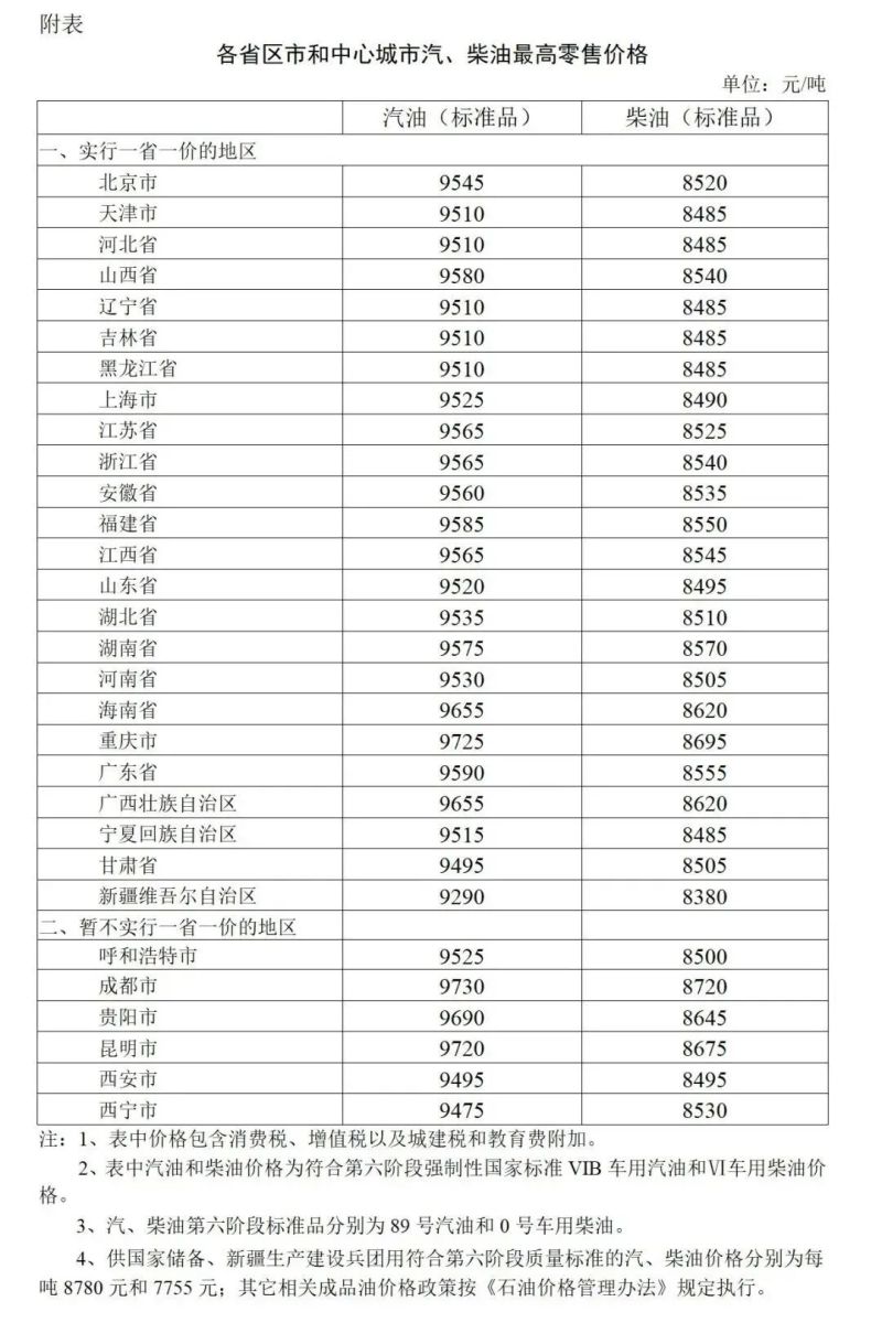 根据近期国际市场油价变化情况,按照现行成品油价格形成机制,自2023年7月12日24时起,国内汽、柴油价格(标准品,下同)每吨分别提高155元、150元。调整后,各省(区、市)和中心城市汽、柴油最高零售价格见附表。相关价格联动及补贴政策按现行规定执行。