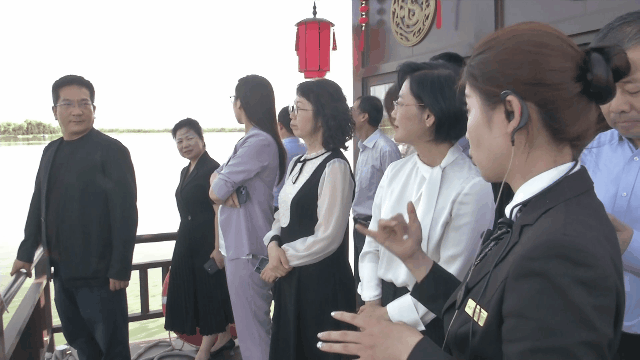 “园区内汉武群雕威仪穆穆,池水波光粼粼,桃林里碧桃簇簇,茗香馆茶香绵绵……”泛舟于一池碧水之上,讲解员黄琛指着汉楼船、鹊桥仙、二十六婚雕、澄碧台等景观一一介绍。
