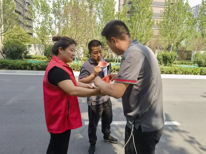 来自上林街道国润城社区、扶苏路社区、三里桥社区、金湾社区的党员组成服务队,走上街头为高温下辛勤付出的快递外卖员送去西瓜、甜瓜与解暑绿豆汤,同时联合爱心企业开展免费赠饮、清凉礼包赠送等活动,并提供电动车长期免费维修服务。此外,还联动辖区医疗机构开展免费体检,增设专项筛查,错时开辟“绿色通道”,确保快递外卖员“随到随检、即检即走”,让健康服务更便捷、更暖心。