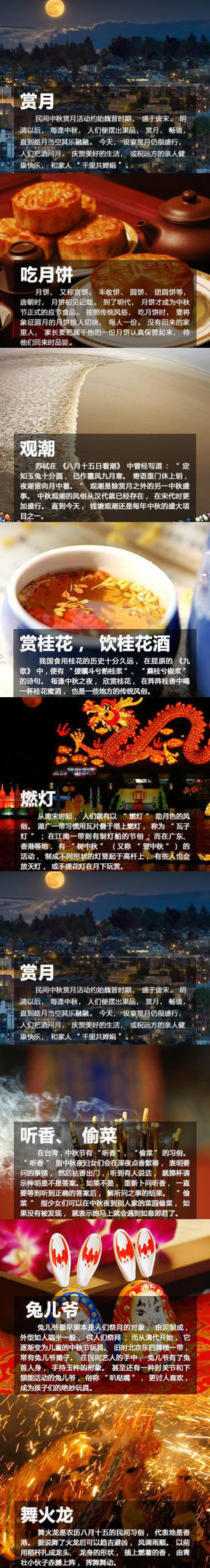 看看下面这些传统的中秋习俗,你都知道几个:①赏月;②吃月饼;③观潮;④燃灯;⑤兔儿爷;⑥赏桂花,饮桂花酒;⑦拜月;⑧听香、偷菜;⑨舞火龙。只听说过前两个的请默默分享。