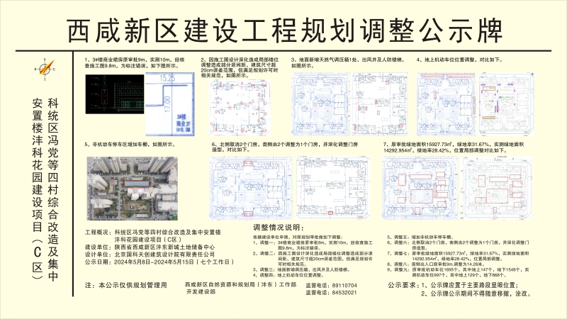 根据西安市自然资源和规划局《关于加强建设工程规划条件核实管理工作的通知》,现将科统区冯党等四村综合改造及集中安置楼沣科花园建设项目(C区)规划许可内容调整予以公示。批前公示并非最终审批结果,在公示期内,利害关系人若有意见,可来电向西咸新区自然资源和规划局(沣东)工作部、开发建设部反映。