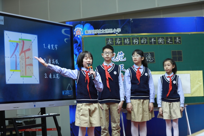 活动中展示的三年级写字课《木韵成长之旅》由李婕老师执教,课堂以“秦小万”为线索,带领着孩子们聆听“木”的故事,书写木字家族的传奇。五年级写字课《左右结构的平衡之美》由师芳芳老师执教,她结合学校的本土文化,课堂以“德”字为引,带领着孩子们了解“德”字的平衡之美,书写“立德为本 知行学思”,就学校四栋教学楼的名称“春作、夏长、秋敛、冬藏”展开讨论,分析其中左右结构的汉字书写,孩子们在分享中感悟着平衡之美,体悟着四季更替的发展规律,自然与人的循序发展。