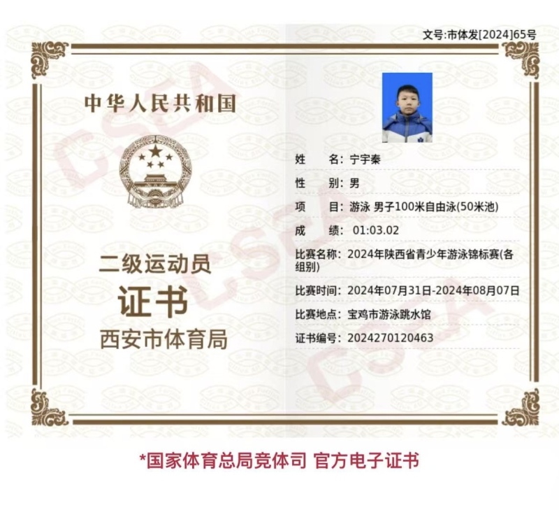 宁宇秦来自西咸新区沣东昆明池学校,7岁开始学游泳,目前是国家二级游泳运动员,在2024年陕西省青少年游泳锦标赛中获男子丙组自由泳全能第一名、蛙泳全能第一名、4×100米自由泳接力第一名,展现出精湛的运动技巧和良好的素养修养。他认为竞技体育的追求不只是“夺金一刻”,更在每一次的全力以赴,专注当下是最重要的。