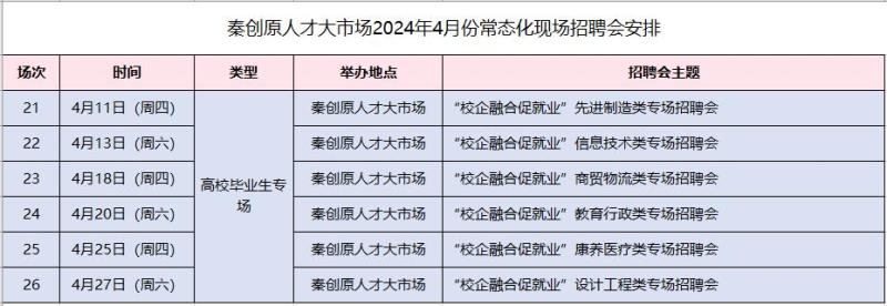 “就业先锋”持续推进“春风送岗”活动,4月份 秦创原人才大市场将举办6场不同主题类型现场招聘会,满足各企事业单位和广大求职者双选需求,具体安排如下。