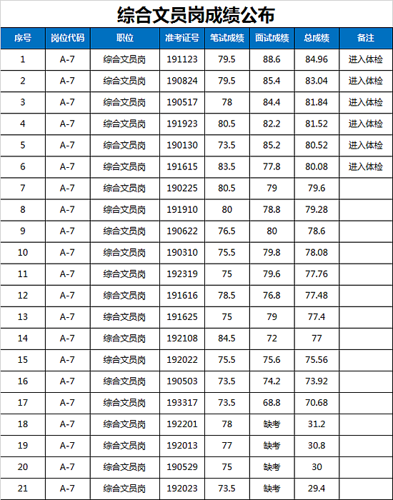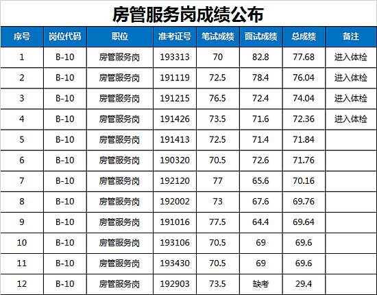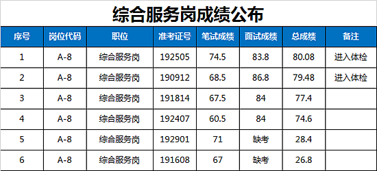 西咸新区管委会公开招聘派遣制员工资格复审、笔试、体能测试及面试工作已于2019年1月19日全部完成,现将面试成绩及进入体检人员名单公告如下: