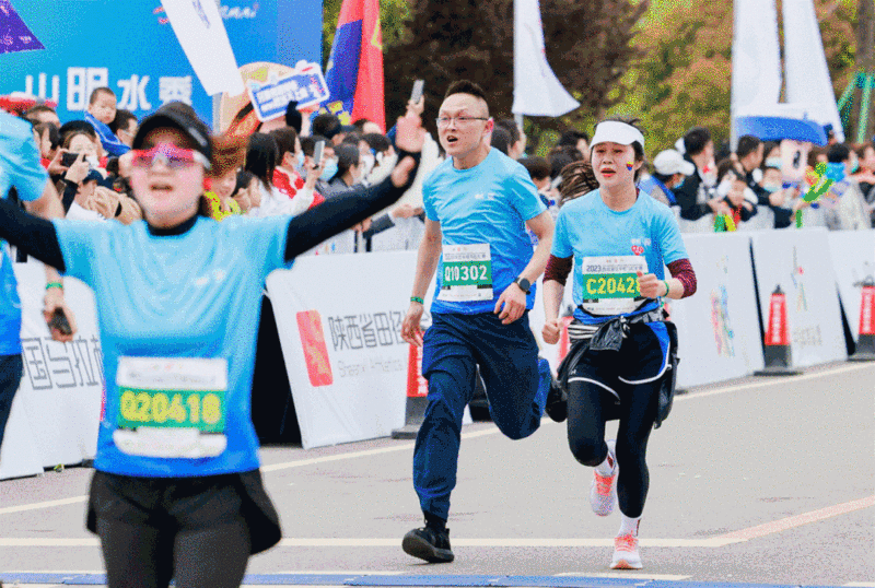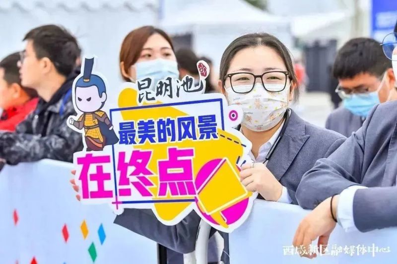 半马选手们一路从昆明池·七夕公园的拱门出发,依次经过云汉广场、昆池大道、鱼斗路,进入到昆明池·七夕公园,沿池滨西路和池滨东路,最后向终点冲刺。一开始,选手们还没有相互拉开距离。渐渐,竞技状态较好的选手逐渐领先。规律的步伐伴随着呼吸的节奏,不断向前奔进。欢乐跑的选手们更加享受运动本身的乐趣,时而快速奔跑、时而慢下脚步拍照,有的一家三口还手牵手前进,欢声笑语不断。热情的市民和选手不仅见证了荣耀与梦想的碰撞,更见证了运动员们超越自我、挑战极限的精彩瞬间。