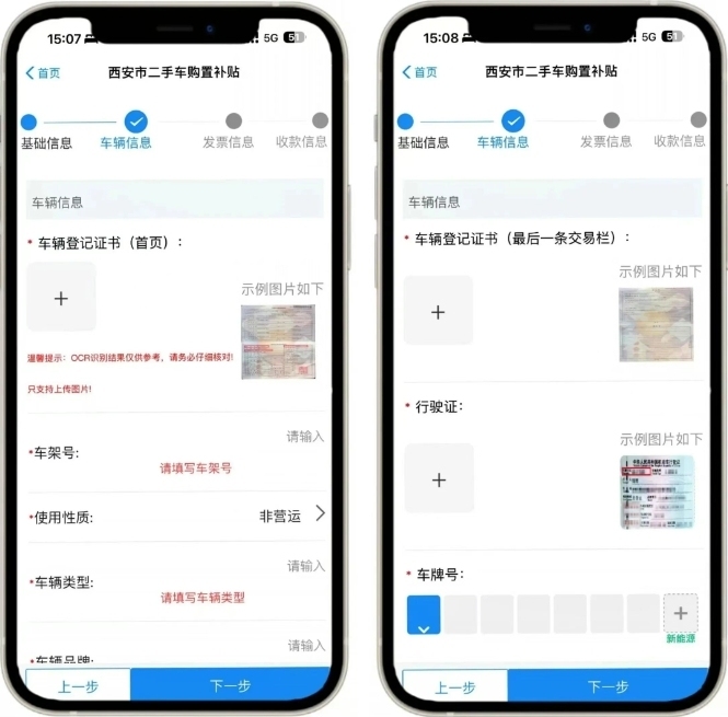 1.请上传机动车登记证书(主页正面车辆信息、副页档案信息以及登记栏车辆转让信息)图片和行驶证(主页正面车辆信息)图片,系统将自动识别并回填相关信息。