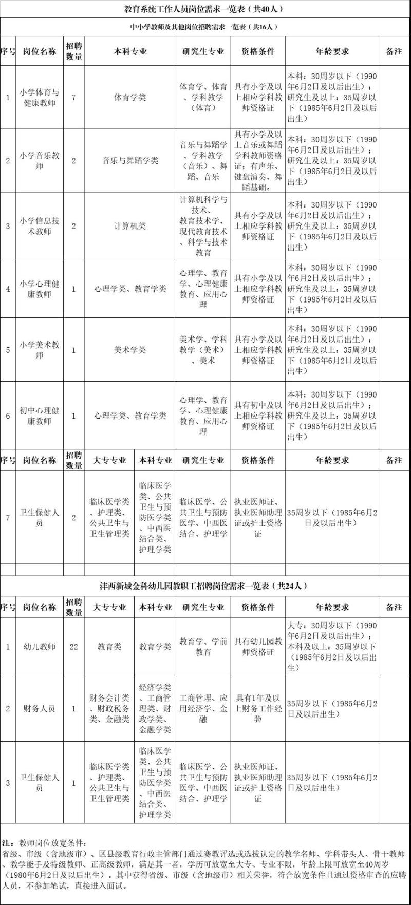 此次公开招聘计划招聘74人,其中教育系统40人、卫生系统34人,具体岗位及人数见文末附件1、附件2。