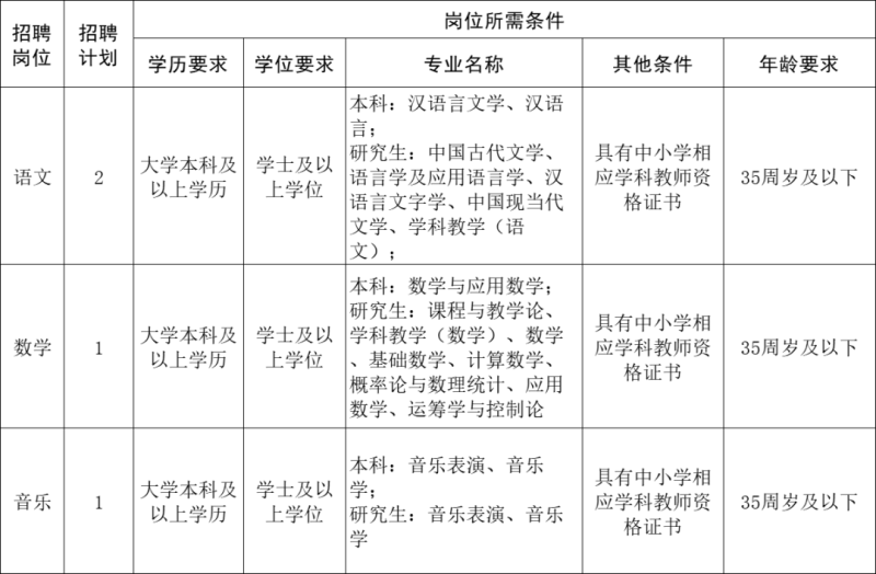 4.具有招聘岗位所需的学历、专业或技能条件。其中,学历为国家教育行政主管部门认可的本科及以上文化程度;专业以国家教育行政主管部门公布的专业目录为准。获评省级、市级教学能手、骨干教师、学科带头人、教学名师、特级教师称号或优秀教师、优秀班主任、师德标兵、“四有好老师”等称号的,学历可适度放宽,专业不限。毕业证、学位证以及招聘岗位所要求的证书须于2023年9月30日前取得。