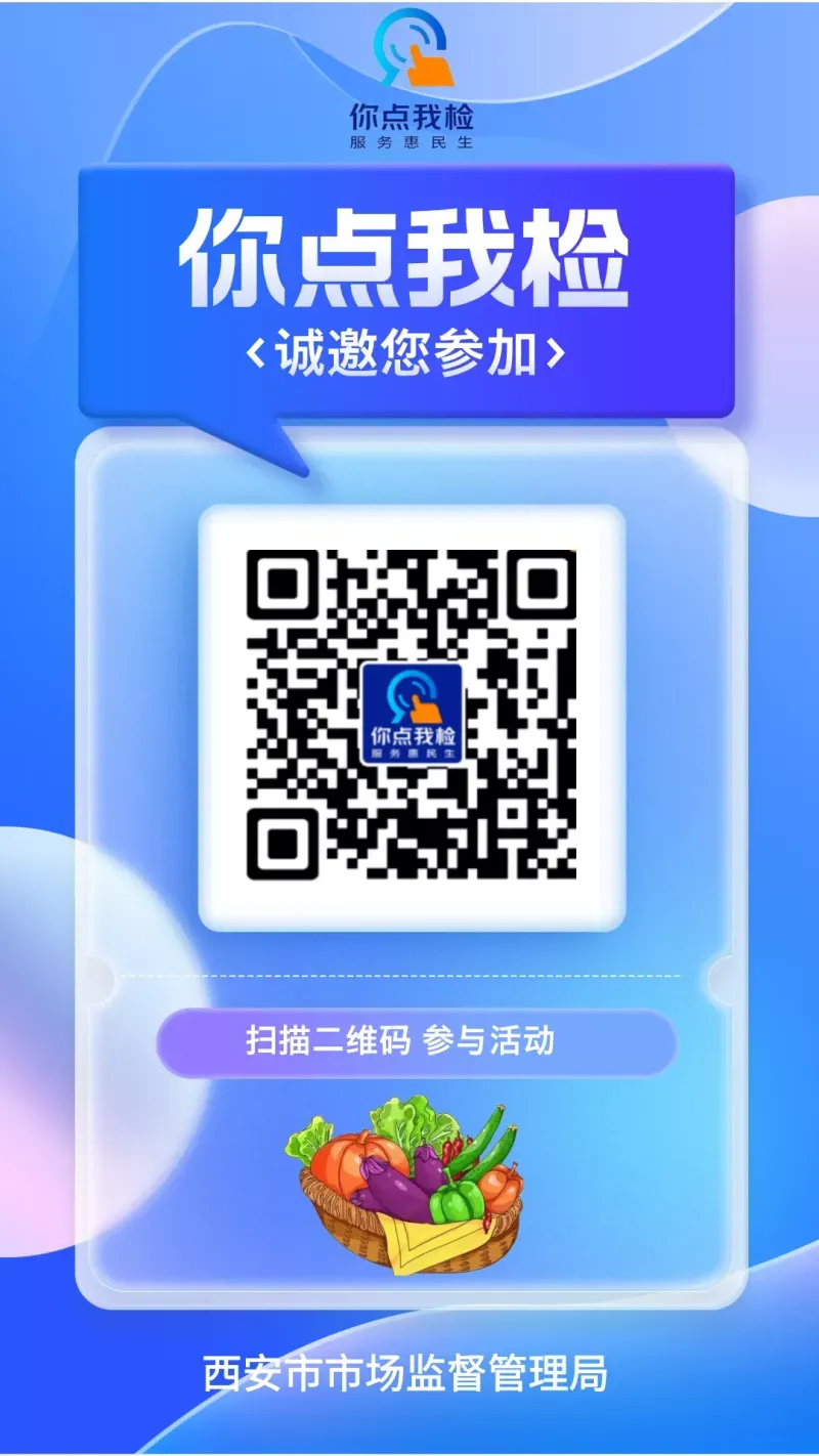 “民以食为天,食以安为先”,为了让市民朋友吃得更开心、吃得更放心,西咸新区市场监督管理局诚邀您参加“你点我检 服务惠民生”活动。通过线上征集您最关注的食品安全问题,按照食品安全监督抽检程序要求,开展食品安全专项抽样检验,并及时向社会公布抽检结果,回应您对食品安全的重要关切。