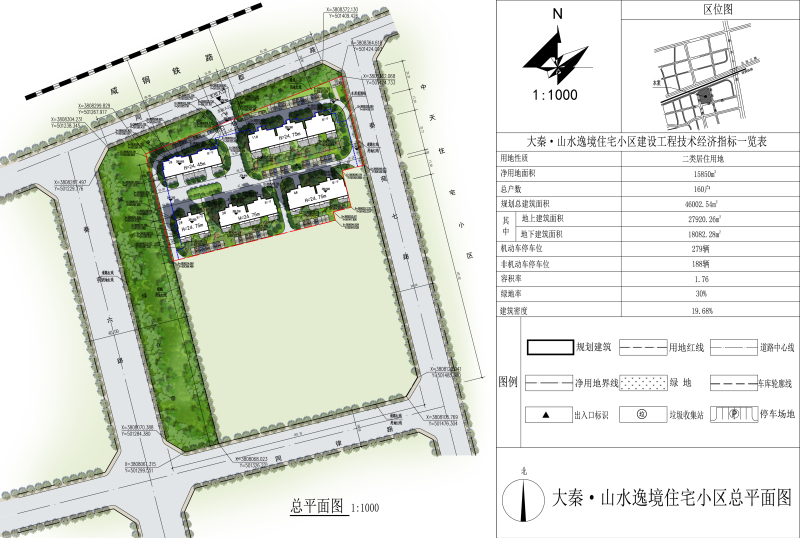 项目概况:项目位于西咸新区秦汉新城秦苑六路以东、秦苑七路以西、同郡路以南、同律路以北区域。大秦·山水逸境住宅小区项目规划净用地面积15850㎡,总建筑面积46002.54㎡,主要建设住宅及相关配套,该项目设计方案经文物部门审查同意。详见总平面示意图。