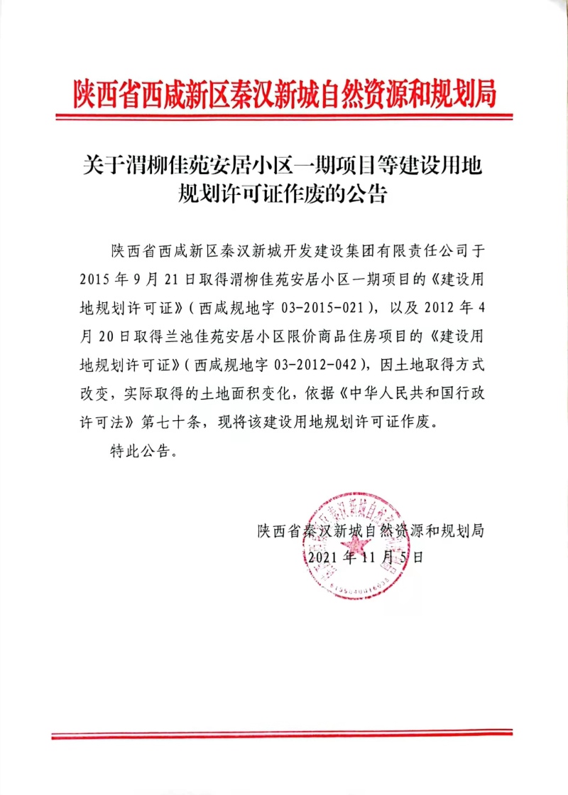 关于渭柳佳苑安居小区一期项目等建设用地规划许可证作废的公告