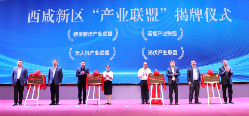 在揭牌环节,西咸新区负责同志与区内龙头企业代表共同为新区装备制造、氢能、无人机、光伏“产业联盟”揭牌,产业联盟的成立对构建产业生态体系,推动新区各产业转型升级、为区域发展打好基础将起到积极推动作用。